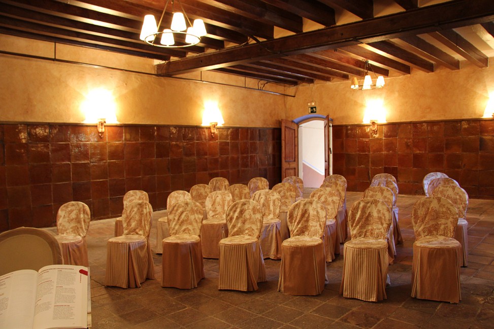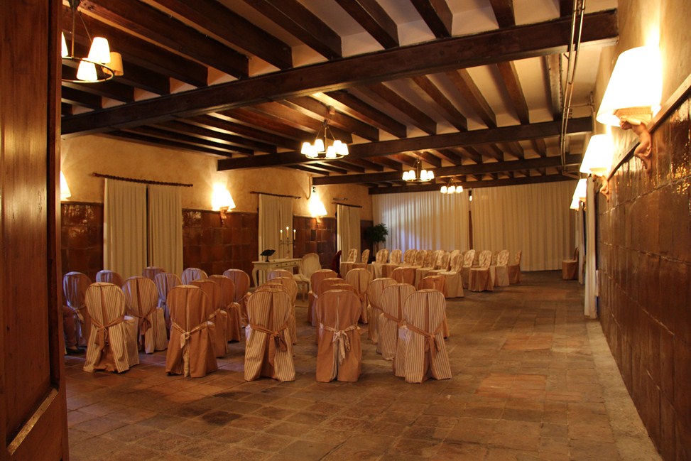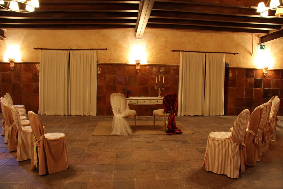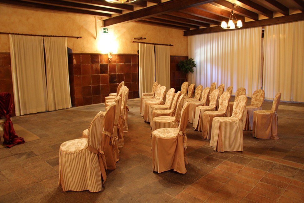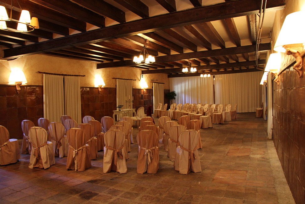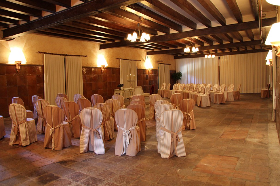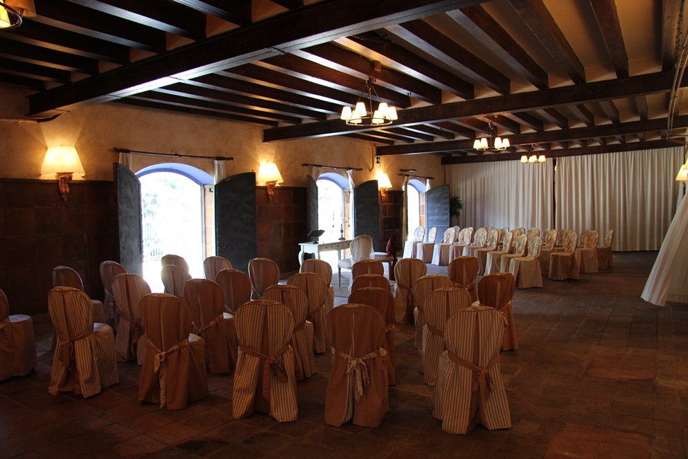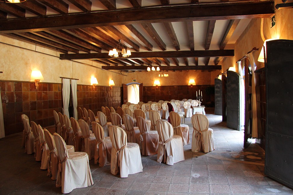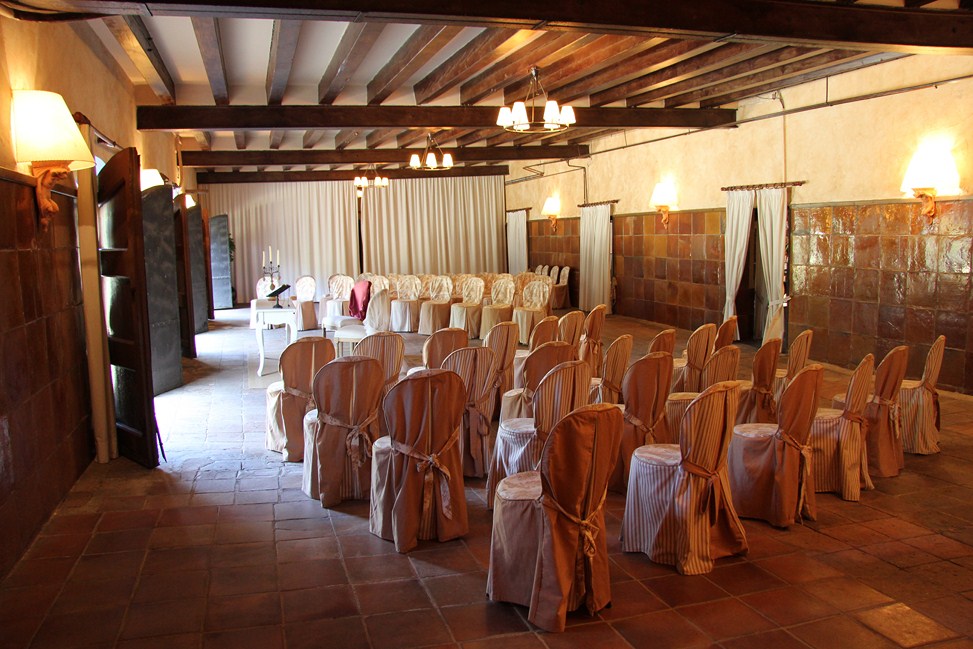 La sala de tines, amb entrada directe des del pati, s'hi pot fer l'aperitiu a cobert en cas de pluja o celebrar-hi la cerimònia civil, quedant independent del celler. Es denomina sala de tines perquÈ antigament era l'espai on es descarregava el raïm, es premsava i s'evocava als cubs per a la fermentació del most. Avui en dia les entrades als cubs estan tancades però el terra es manté l'original, per aquest motiu el terra és irregular però permet respirar l'olor a celler autèntic.